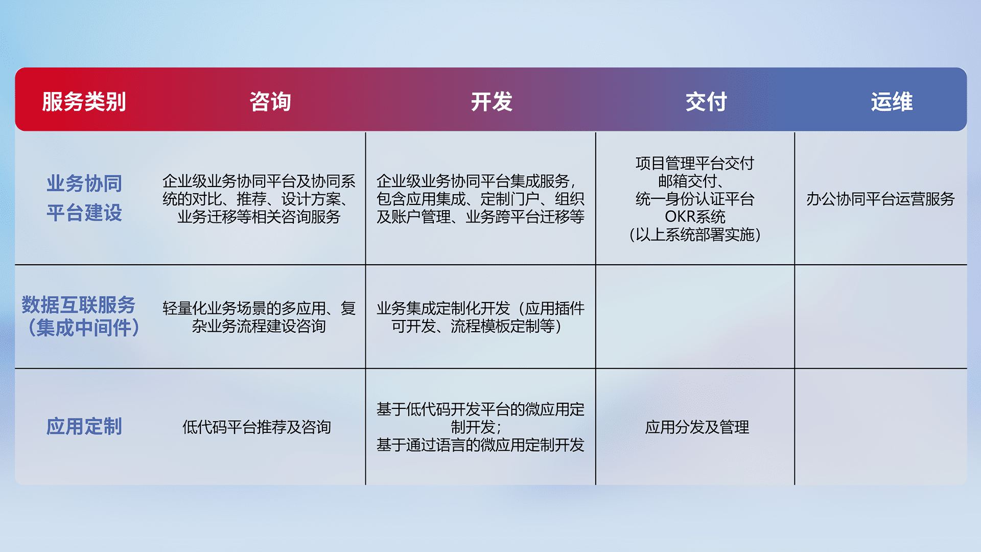 针对钉钉、、、企微、、IDaas等平台级产品提供产品的规划、、方案、、、、交付、、、定制化开发等服务,,,,实现如统一协同办公、、智能客户服务、、、、混合会议管理、、、智能数据查询、、、等业务场景,,,实现数字化转型。。