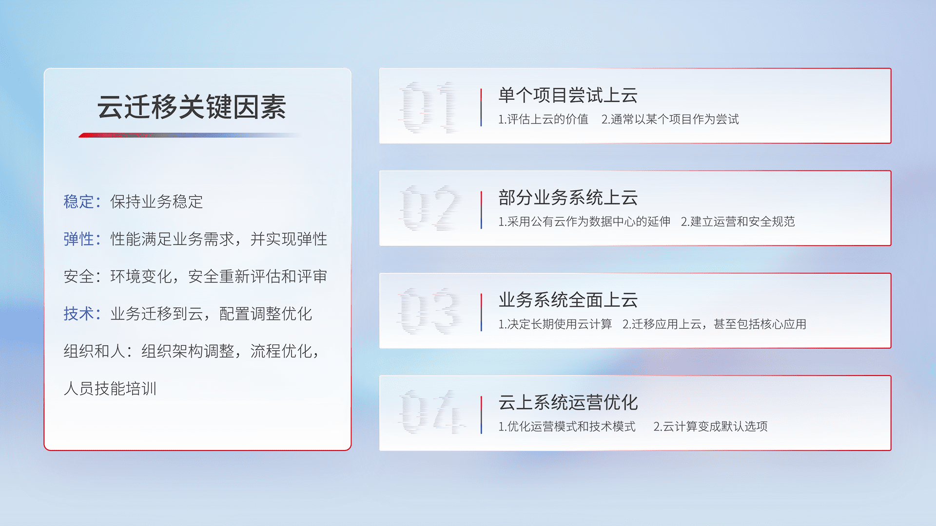 结合实际业务,,,,从规划设计、、、、云平台选型、、云原生改造、、、数据迁移、、、集成交付,,,迁移全过程为客户识别最佳上云路径,,做好风险识别管理,,,,设计网络架构、、身份权限、、安全审计合规、、、操作审计、、、、日志审计、、、监控告警策略、、多站点容灾设计等,,对云上基础设施进行整体规划,,,提升IT治理水平,,以满足弹性、、、、高可用、、高性能的需求。。