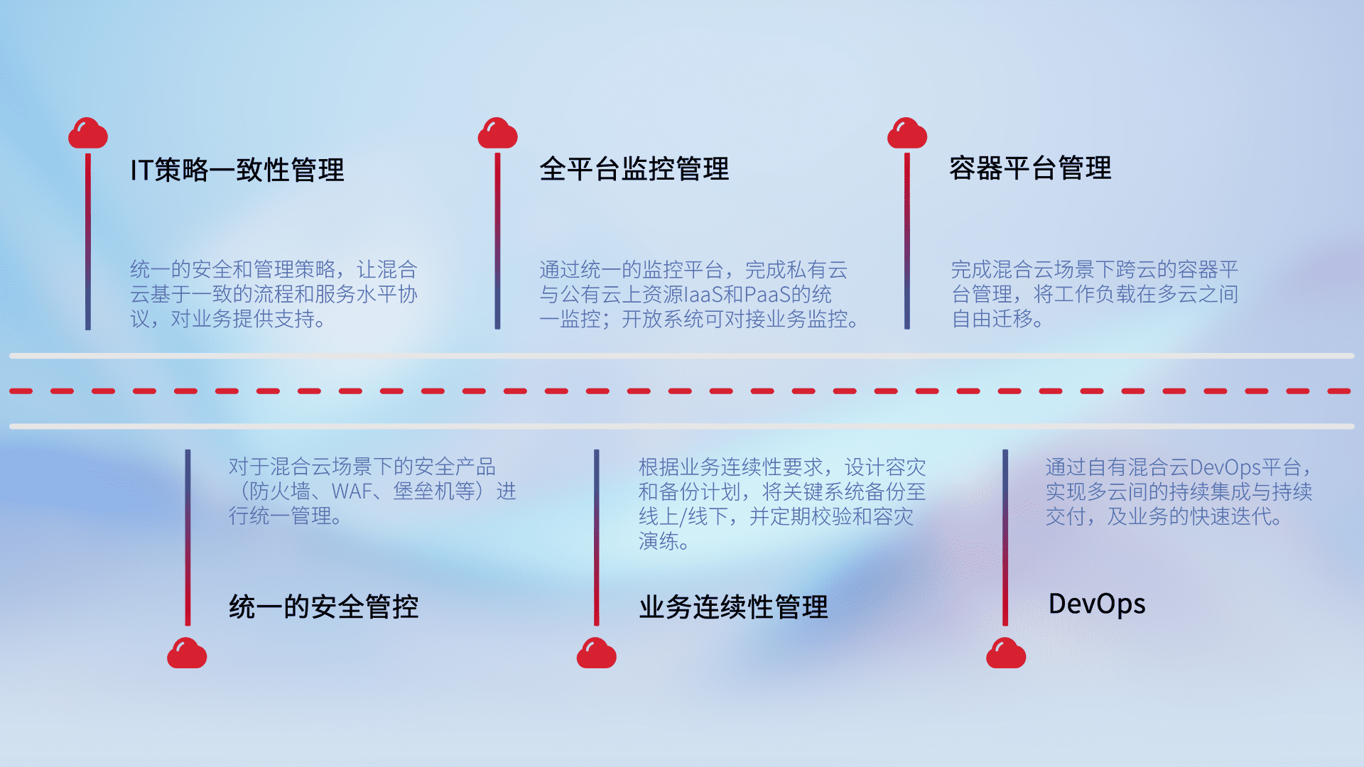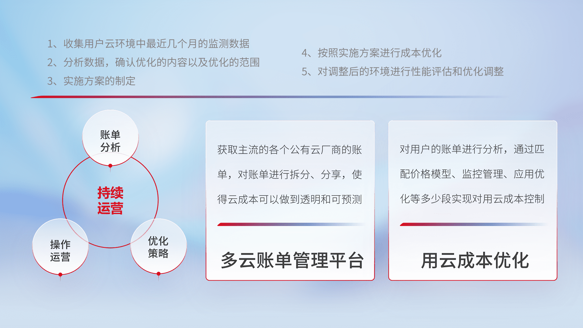 通过多云纳管,,,,以统一的资源数据模型把客户的云资源进行抽象和封装,,,进而实现对多云资源的统一操作,,保障云资源管理的可靠性、、稳定性与可用性。。量身定制化运维内容,,,配置、、、开发运维、、、、补丁管理、、、、备份、、、、监控、、认证和访问管理、、、审计和日常巡检等,,,保障在用云过程中的可靠度,,,稳定度以及高可用率。。。。